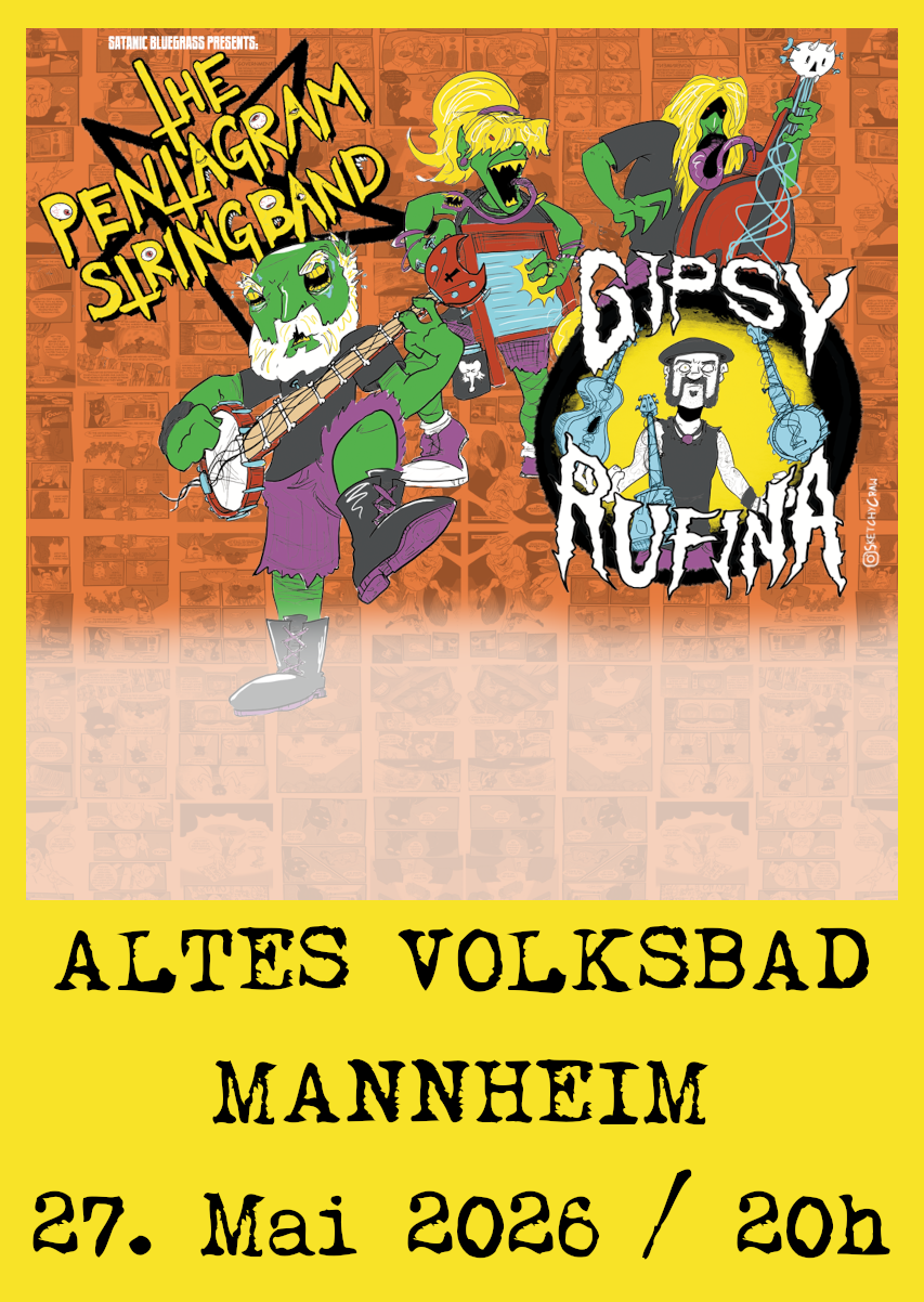 Die Pentagram String Band sind eine satanische Bluegrass-Band aus Kansas City, Missouri. Sie stehen dem traditionellen Bluegrass skeptisch gegenüber und spielen eine Mischung aus Gothic Folk, Punk und Thrash Metal. Ihre Texte drehen sich oft um Kannibalismus und Mord und behandeln Themen wie Satan, Elend und die Freuden des Todes. … und es sind großartige, nette Menschen mit einem guten Sinn für Humor!